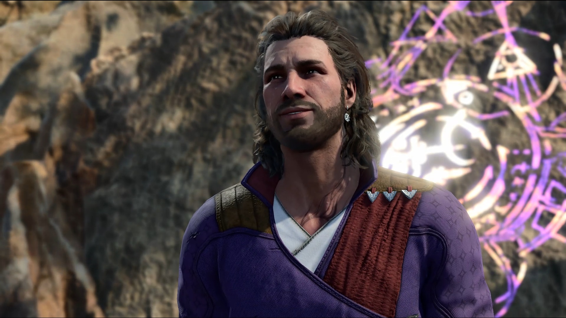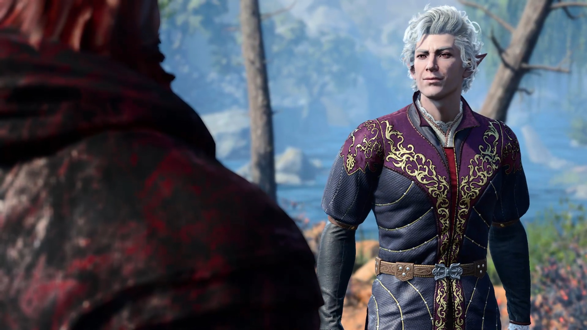 Off in the distance we hear faint and casual calls for help. As Shadowheart and I walk up the bank we see a man standing by some reeds. He's dressed in finer clothes, royal purples with golden filigree. A high elf with perfectly coiffed white curls and pale skin.