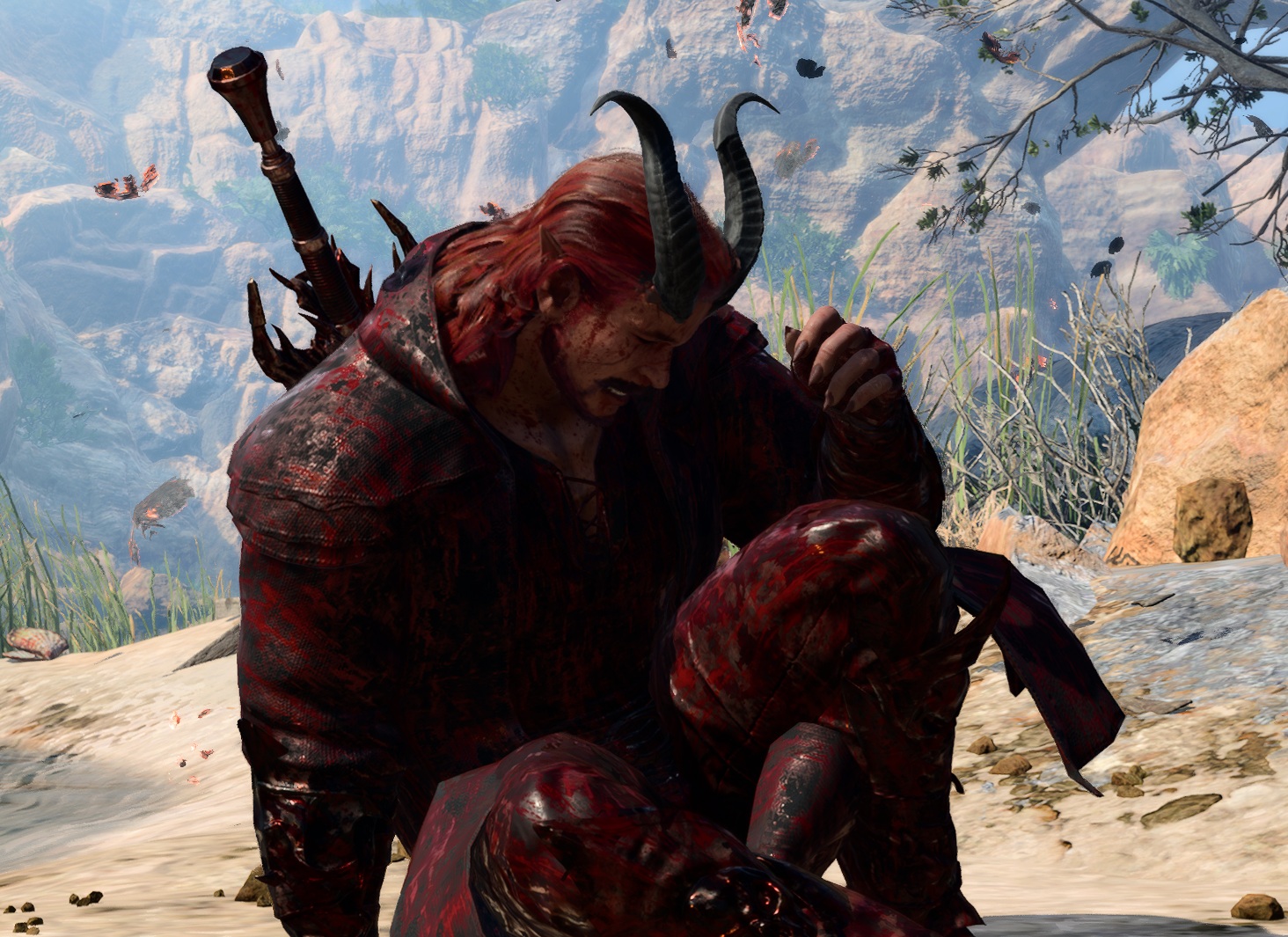 I wake up with a gasp, as if being raised by the dead. Sky. Land. I've landed. How? As I painfully lift myself to my feet my brain splits and throbs behind my eyes and a single word prevails in my mind, "Blood. Blood. Blood. Blood. Blood." My skin is crawling, it's maddening, I need to find a healer as soon as possible, but where am I? There is a river to my right but the shoreline is unfamiliar, and the ruined Nautiloid around me isn't helping me get my bearings. There are bodies scattered everywhere, but I see a glint in the distance. As I approach it, I recognize a familiar face. Shadowheart, her mail gleaming in the sun, but she appears to be unconscious. I kneel and check for a pulse, she's still alive. I reach to wake her but hesitate, the thought crosses my mind, she looks so peaceful. She would look far more peaceful if she were dead. A small pulse of calm as I reach for her throat. No. Why does the thought settle the torrent in my heart? It's a wonder we survived at all, and she could still be useful. My vision goes out of focus for a moment and then suddenly I'm back, but my hands are twitching. I push past the foul urge and gently shake her awake.