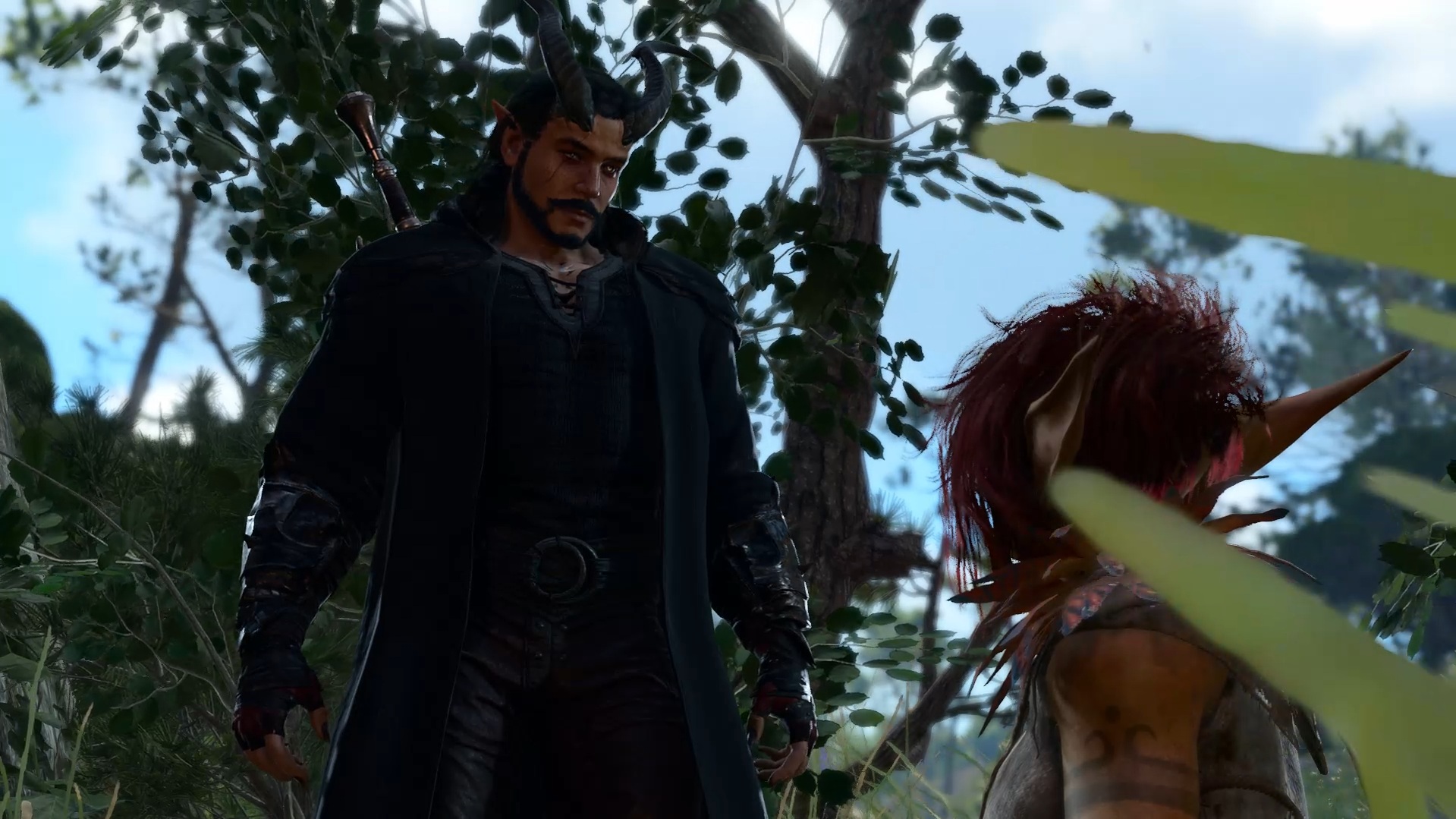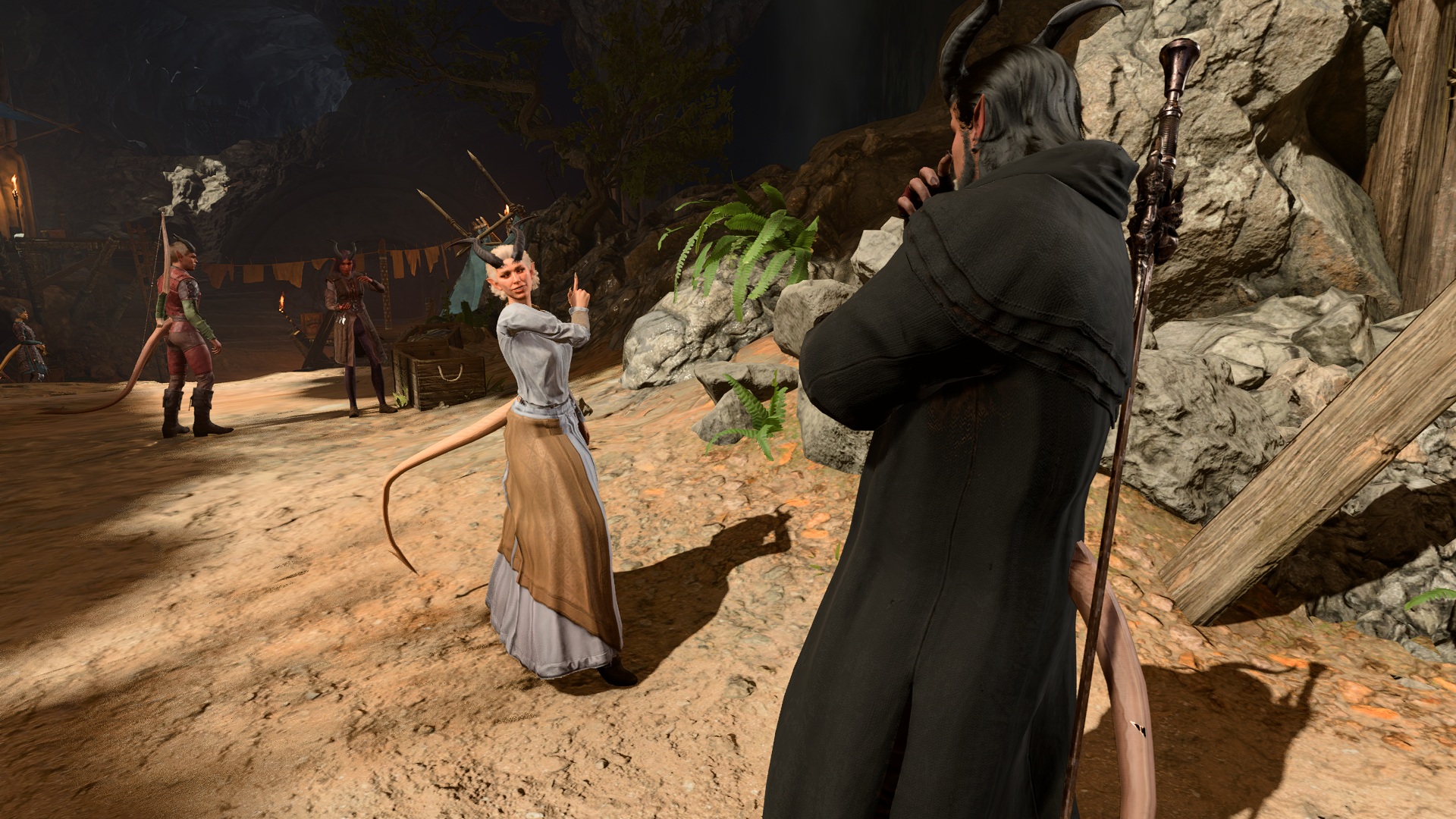 I snatch her hand in mine as she grips her hilt, pulling her back sharply. The blade's sheath rattling against her armour as she falls back into me. I catch her and set her back on her feet. "Stop, the both of you! This is not the time nor the place for this." I point at Shadowheart, my tone sharp and commanding, "Put that damned thing away!" Looking up at the goblin sentries, I wait to see if we've raised suspicions, but they are all too drunk to see straight. I lower my voice, but hold the weight of my tone, "We can't start bickering over this now, but this does warrant further discussion. Let's finish our business here and address this in more depth tonight."