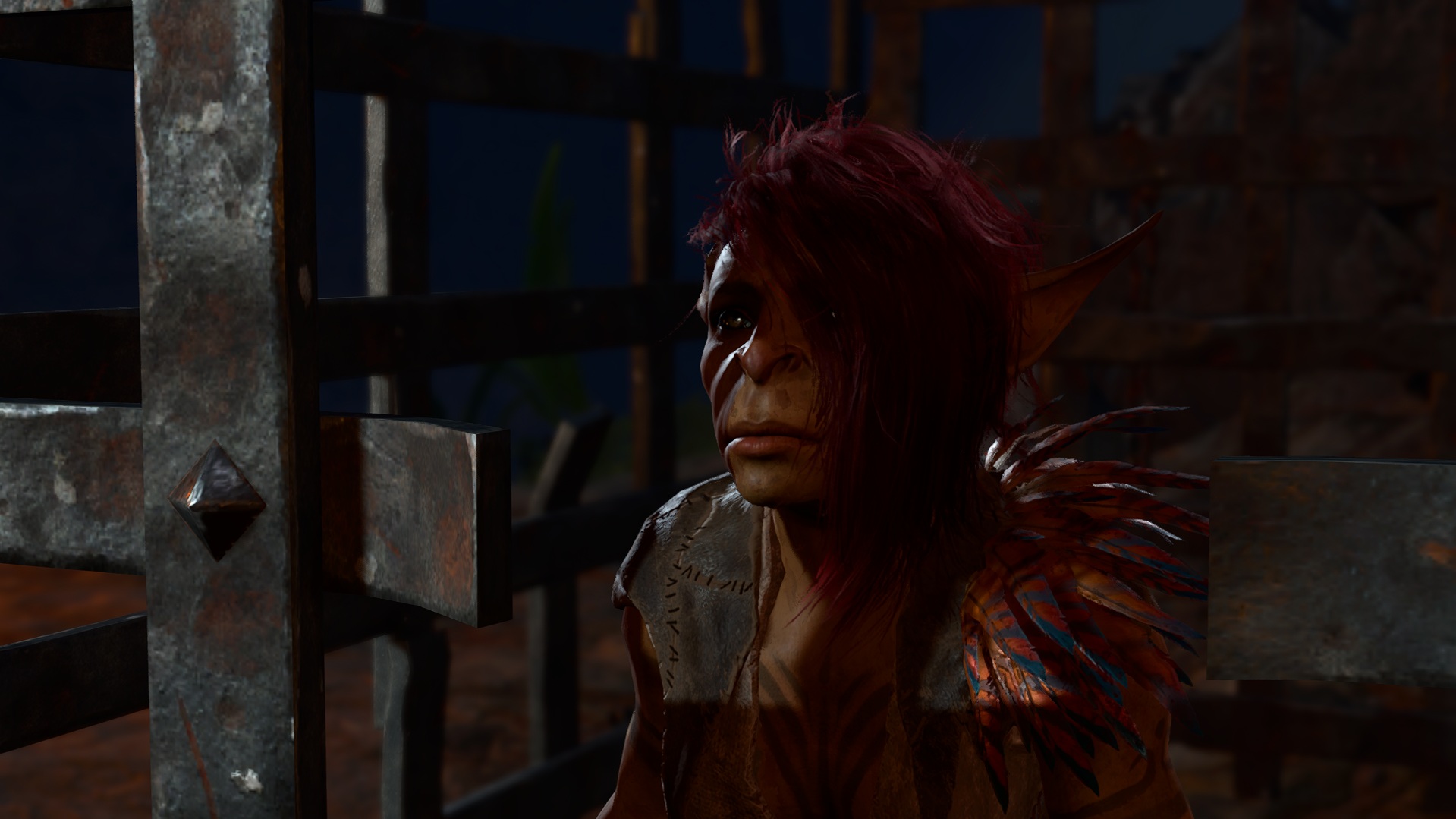 I still feel a little lightheaded but in a strangely euphoric way. The bite didn't seem to unlock any benefits outside of merely draining me of my blood, a pity but still an exciting experience. Astarion also seems to have a skip in his step which is good given what we're up against, anything to keep these people happy so we can keep moving forward. I left them all behind at camp to head back to the hollow for supplies, and to speak to the goblin captive. As I duck into the makeshift prison, I see a woman with a crossbow pointed directly at her. "No!" I sprint over and quickly push the woman's hands upwards as she shoots the bolt hitting the stone wall behind the cage. "What in the hells are you doing!?" My voice echoes through the cavern, edged with a wild frustration, I swear to the fucking gods I will kill every single one of these morons with my own hands if I have to.