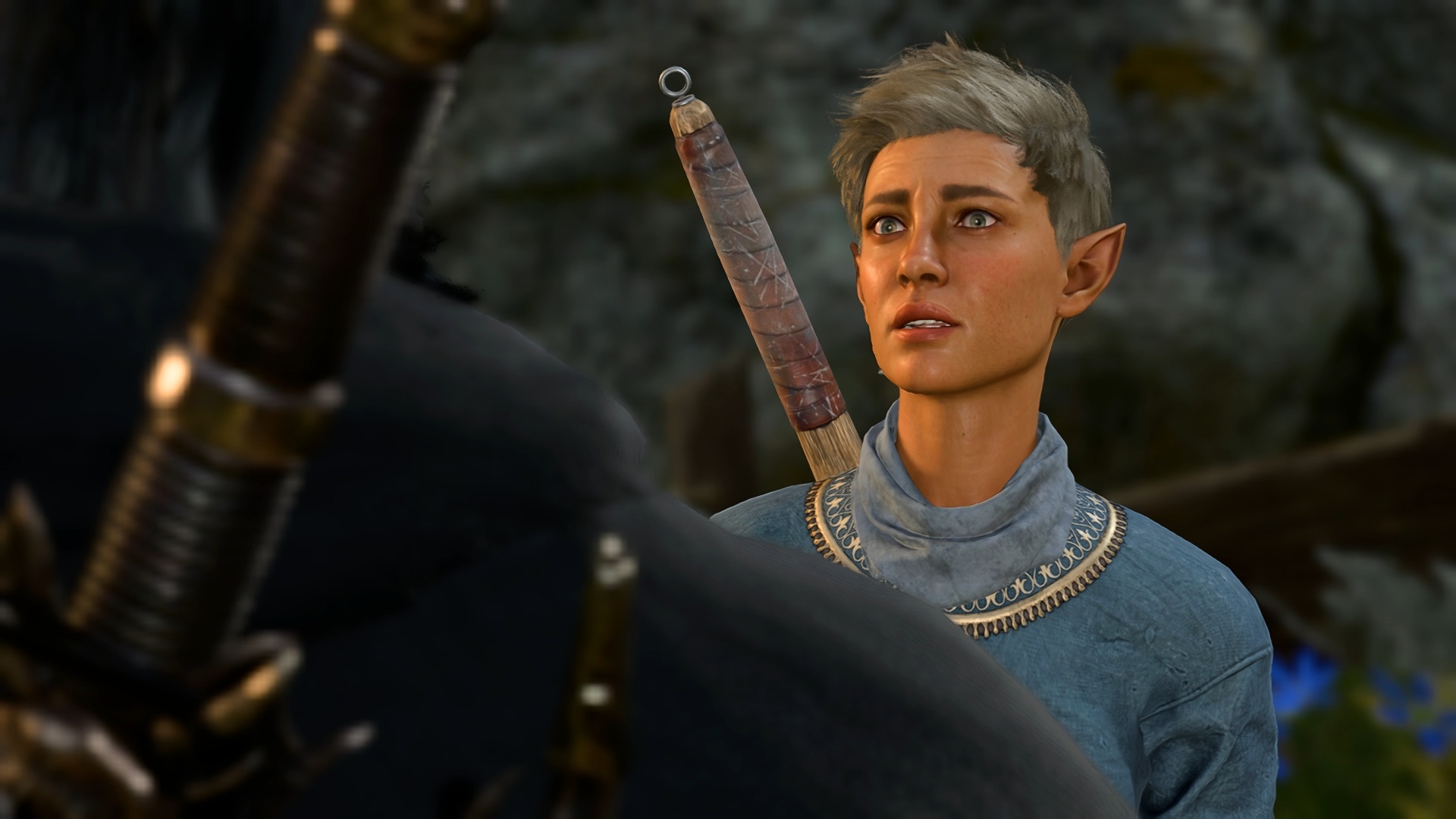 We pause and hear a panicked voice echoing off the surrounding walls. It sounds pleading but we can't be sure until we get closer. Lae'zel leads the way, and we find ourselves behind a hill that splits into two paths that arch around either side. Lae'zel moves but I quickly grab her shoulder and shake my head, putting my finger to my lips, beckoning silence. She scowls at me but remains planted where I leave her, quiet, though agitated. I crouch low and climb the hill, peeking over to appraise the situation. I see a party of three humans standing in the gorge calling up to a tiefling man, holding fast to the winch of a hidden portcullis.