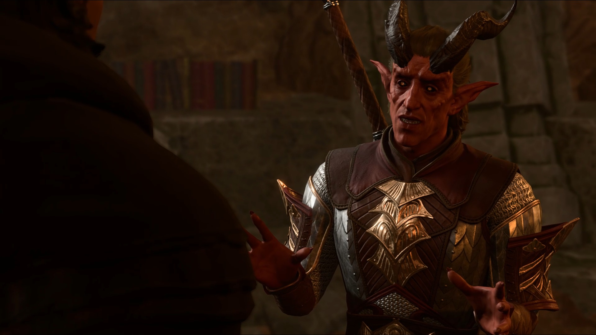 I suddenly hear idle banter and glance over to see the blonde tiefling woman from the parapets. She's speaking to her partner, but something about her has caught my attention.