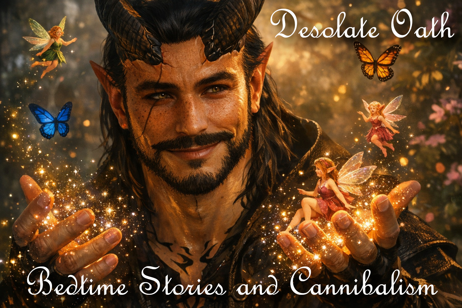 Bex meets my eye. My thumb chases away a drifting tear. My hand trembles despite myself. I finally brush my fingers through her soft curls and her head dips with a reticent smile. I pull her into me and lean down, brushing my lips against her cheek. Her pulse quickens and I feel her sigh. I cradle her head, and with a heavy inhale, I firmly kiss the curve of her neck, as if to drink the air around her. I'm hungry. My tail lashes. Her body falls loose in my hands, and she breathes the softest moan. My fingers grow hot as our infernal nature thrums with longing.